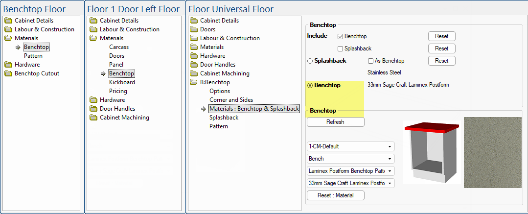 For more details, see also topic on Cabinet Benchtop Material.