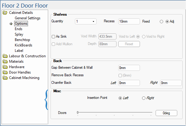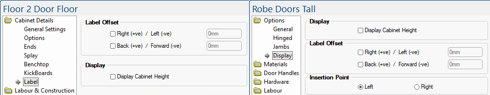 There are a number of ways to customise how cabinet labels are displayed on your drawing. The options provided at cabinet level can be located on different pages, depending on the type of cabinet/item selected, as shown.