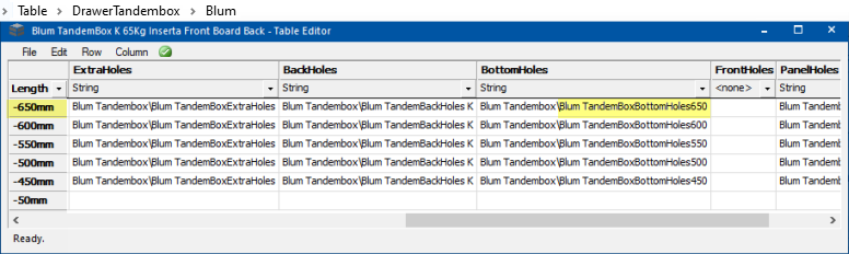 Example: A table called Blum TandemBoxBottomHoles650.qlt is to be used for the drawer Bottom in a 650mm drawer of this type.