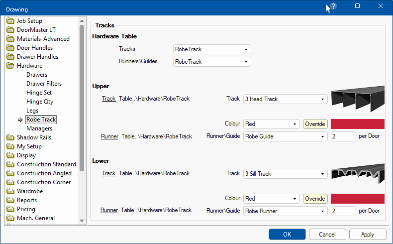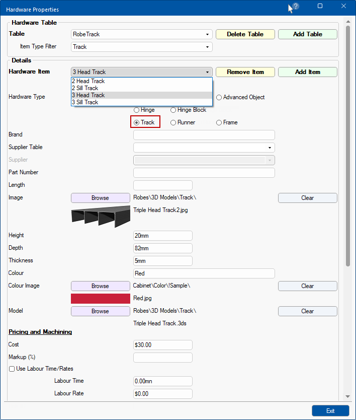 The Hardware Editor provides the ability to create, modify, delete and price hardware, as required and can be accessed in the Catalog/Drawing Properties.