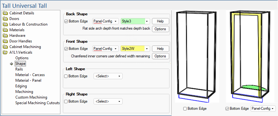 Profile allows you to set the shape of the 'Panel' for the Back, Front, Left and Right of the universal cabinet.