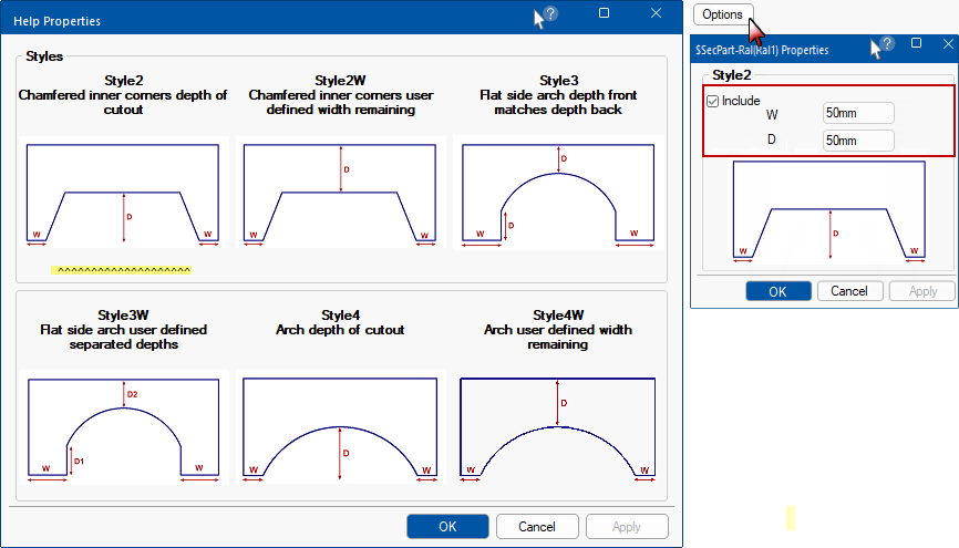 The Options button opens the page as shown below right. This allows you to customise the Width and Depth as indicated by the image of the selected cutout.