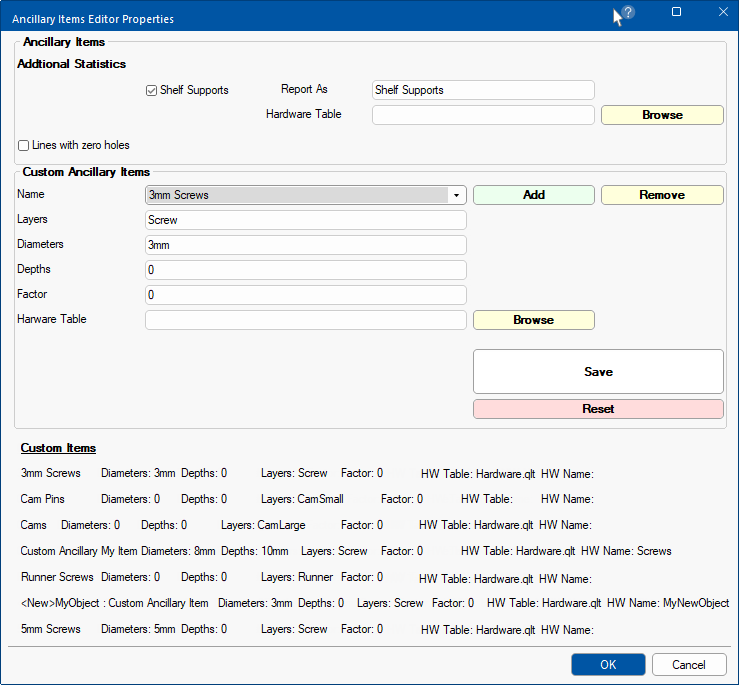 The Ancillary Items Editor button allows you access and save a configuration file that includes the number of holes drilled in a cabinet to be reported based on the layer name, depth and or diameter.