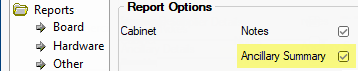 For the Ancillary statistics to show on a report the appropriate report option 'Cabinet Ancillary Summary' needs to be checked on.