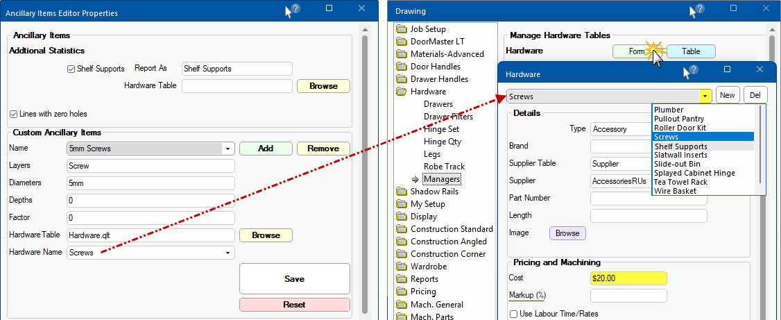 The Ancillary Item '5mm Screws' has been associated with the Hardware accessory 'Screws' which has a cost set to $20 each.