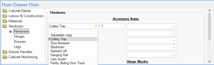 For reporting/costing purposes, the quantity of Cutlery Trays must be manually entered on the Hardware page to correspond with the Drawers page i.e. the Hardware page is not automatically updated.