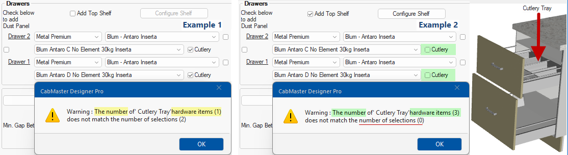 As you can see in example 2, the 3D display is allocated to the top drawer even if the 'Cutlery' checkbox is not enabled because the Hardware page has been allocated with one (or more) Cutlery Tray items, so you will need to check and customise appropriately, manually.