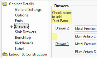 At Cabinet level, the Labour & Construction > Dust Panels page provides options to set the dimensions and position of dust panels between individual drawers. The construction type can be controlled on the Cabinet Machining > Drw Adj page.