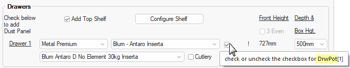 If the number of Cutlery Tray items on the Hardware > Hardware page is greater than zero (0), then extra checkboxes called Cutlery will be made available on the Cabinet Details > Drawers page (click on image below to compare with a Drawers page with zero items).
