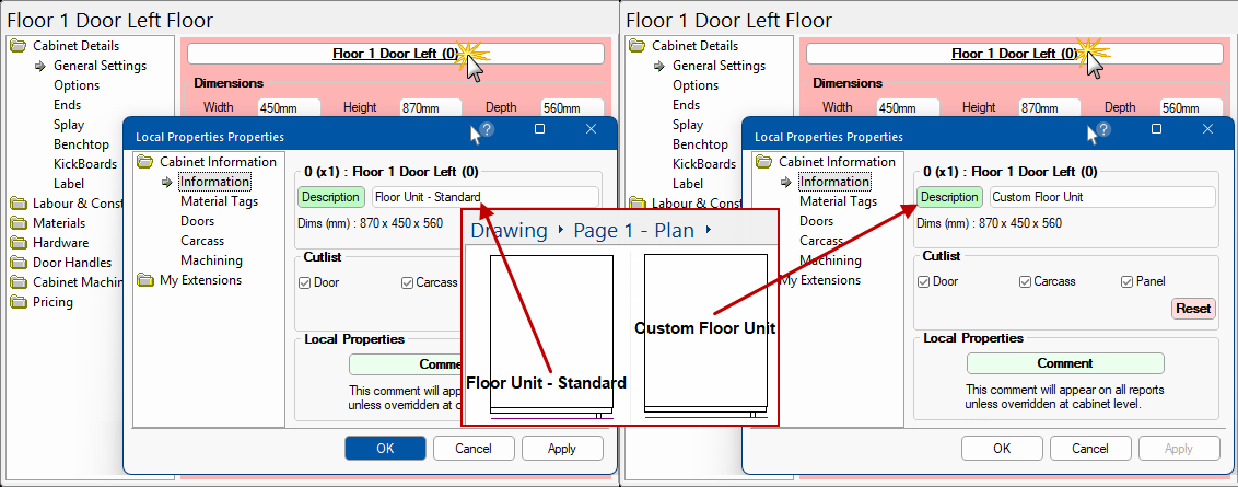 - double click on the cabinet code e.g. Floor 1 Door Left - this opens the Property Inspector displayed with a pink background.