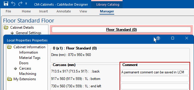 A permanent comment can be entered in Library Catalog Manager as well as the cabinet once place on drawing.