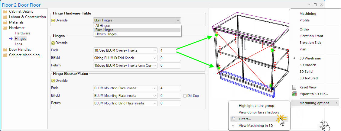 If you wish to override these settings on the current cabinet, then see the Hardware > Hinges page, discussed below.