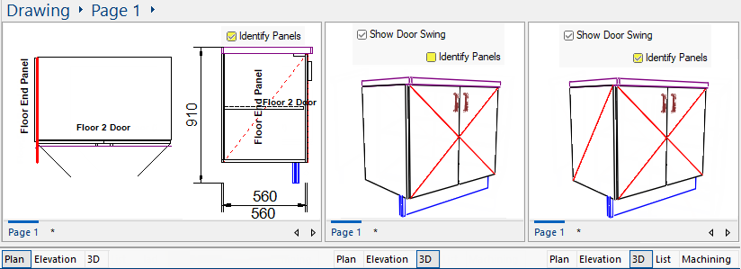 If the Use Material Tags option is enabled, tags will appear over the Doors and Drawers of the cabinets in the Elevation View.
