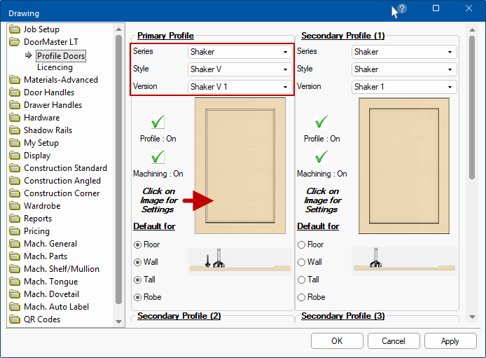 In older versions of CabMaster controls for Profile Doors where located in the Drawing Properties on the Materials-Advanced > Door Options page, used in the video discussion.