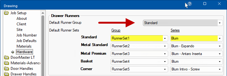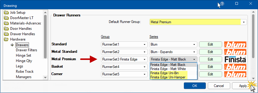 The first cabinet (#1) has Metal Premium drawer runners, which are the default Runner Group applied to all drawers without bins on the drawing.