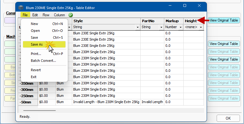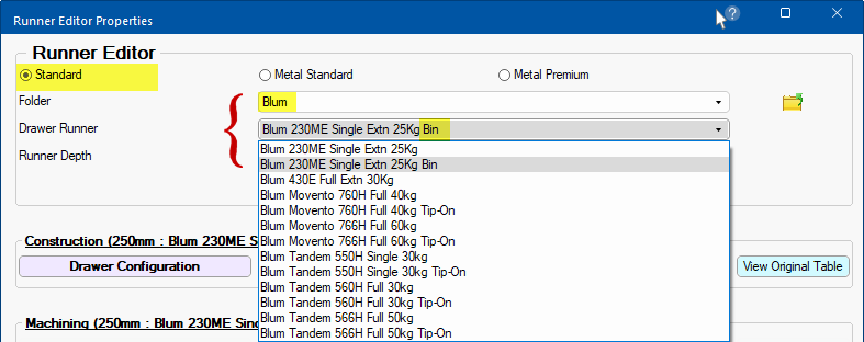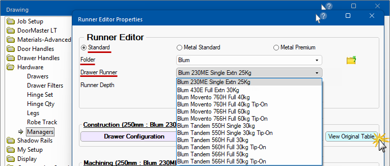 - Drawer Runner that you want to duplicate (e.g. original table Blum 230ME Single Extn 25kg) and rename.