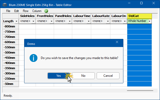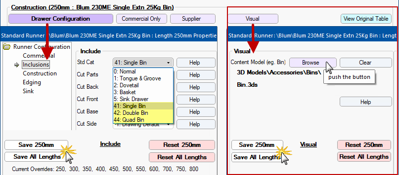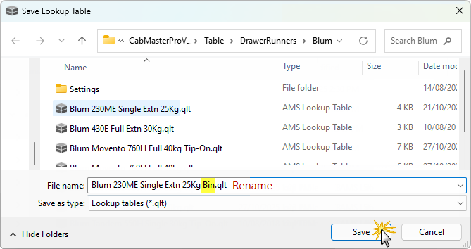 To preserve the Original Table but designate another based on table as a bin, you can Duplicate a Runner Table as we do here to create a 'Blum 230ME Single Extn 25kg Bin' runner table for selection (which we will later designate as a double bin).