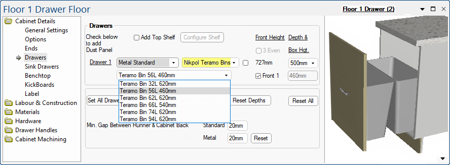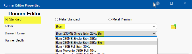 As shown above, the second drawer (2) has been changed to Metal Standard for the Runner Group, to allow the selection of a 'Bin' drawer.