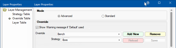 This 'Override' table also includes a 'Default' which is used for unrecognised layer names, therefore the 'Show' option can be turned on to provide a warning message if this occurs.