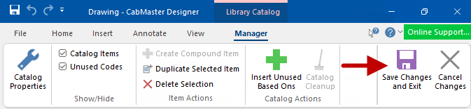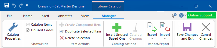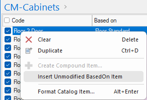 When a new cabinet is added to the library in an update, or if you have deleted a cabinet from your catalog entirely, you can add any missing cabinets to your catalog with the Insert Unused BasedOns option.