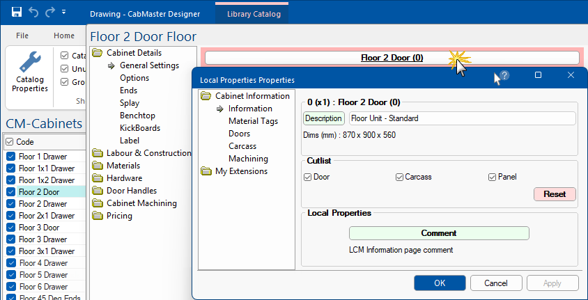 The selected library on the Home tab can then be customised. Individual cabinets e.g. Floor 2 Door (shown below), can have options set in the Library (pink background), which will initially be made available as the Cabinet Tool (blue background) and initially when placed on the drawing (light grey background).