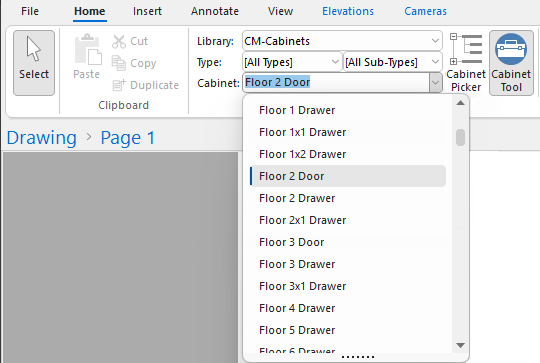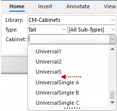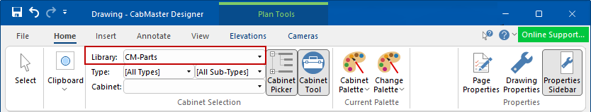 The Library selected on the Home tab, for example CM-Cabinets, will be made available.