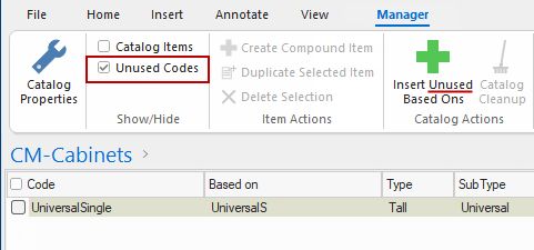 If the Unused Codes check box is ticked (i.e. Show) but the Catalog Items is unticked (i.e. Hide) it will display only those cabinets that will not be made available in the cabinet selection on the Home tab (as shown above right).