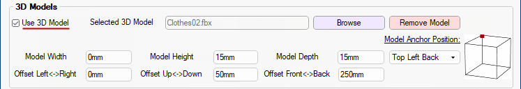 The Model Width, Height and Depth values are the default dimensions of the 3D model.