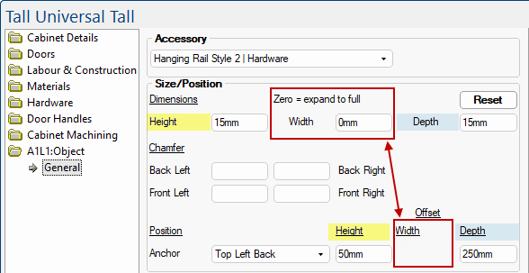 Note that only the Offset for Height and Depth are made available for input, as the Dimension for Width is 0mm, therefore offset is not applicable.