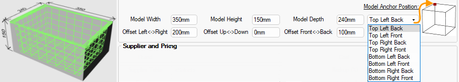 The Offset values will move the origin point of the model from the corner indicated by the Model Anchor Position drop list and confirmed in the diagram.