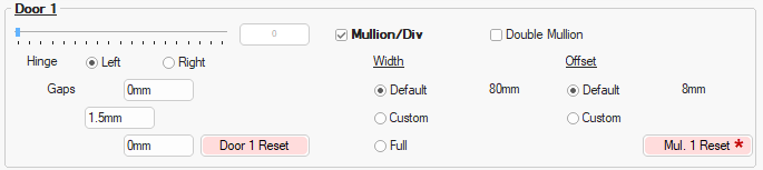 Defaults are set on the Construction Robes > Door Configuration page and the Mullion Reset * buttons reapplies the Offset settings of the Mach.Shelf/Mullion > Mullions page of the Drawing Properties.