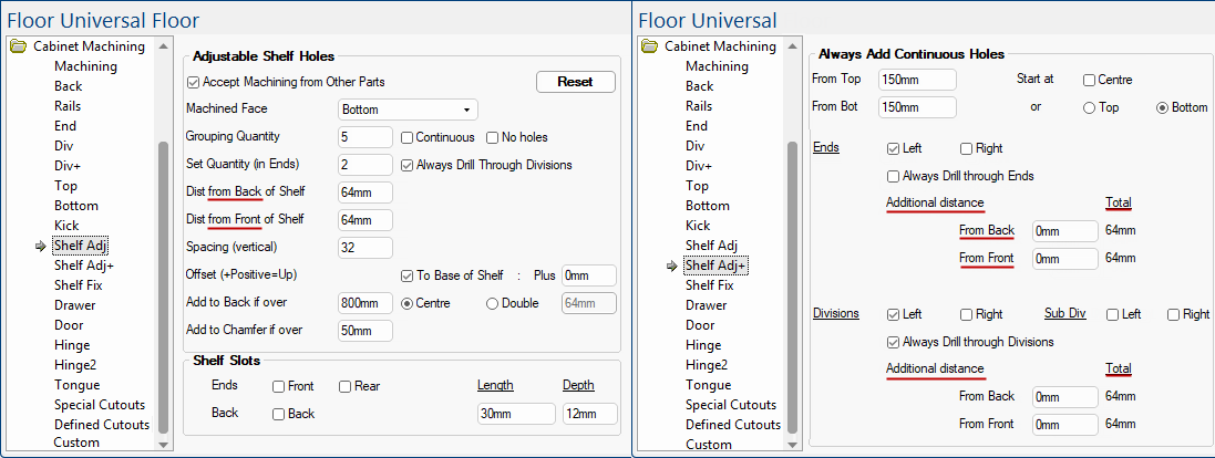 The Shelf Adj+ page options are used to adjust the Top/Bottom gap when holes are continuous.