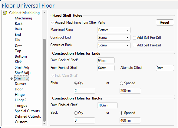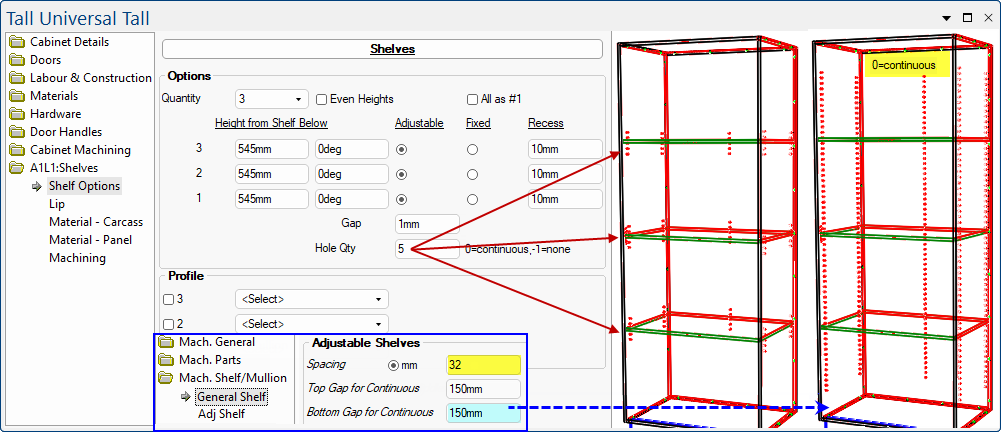 The Shelf Adj page options are used to determine if holes are required, the number and spacing of machined holes.