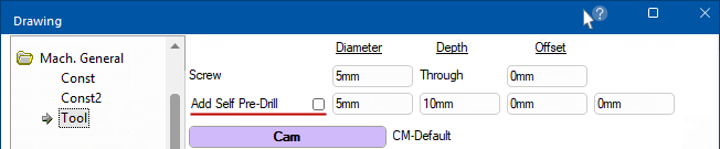 Add Self Pre-Drill default can be set on the Mach.General > Tool page of the Drawing Properties but is only applicable to Screw Construction.