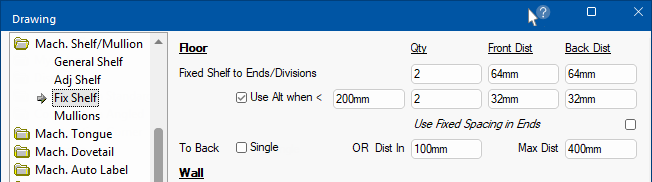 Defaults are set on the Mach.Shelf/Mullion > General Shelf page of the Drawing Properties, shown below inset.