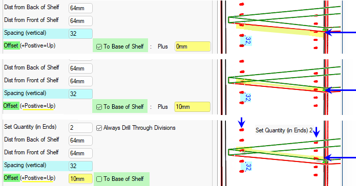 For the End panels in these examples, the Spacing of vertical holes is 32mm (highlighted in blue) and the Offset options are illustrated in yellow.