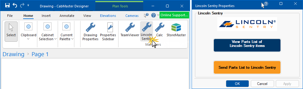 An ordering interface, reports and drawer tables are available. This means that hardware items included in a drawing/job, which are supplied by Lincoln Sentry, can to be automatically sent to the supplier website to create an on-line order. This is accompanied by a CabMaster report listing the items.