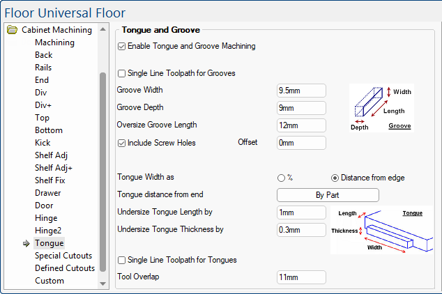 This topic discusses the Cabinet Machining > Tongue page of the Cabinet Properties for Universals/Robes.