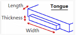 When considering what is represented by the terms Thickness, Width and Length of the tongue, consider how you would describe your own tongue. Its Thickness will be from top to bottom, Width from side to side and Length from front to back sticking out of the part.