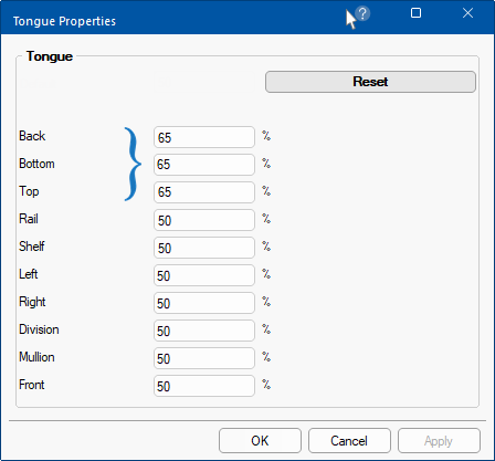 Set the tongue as a percentage of side length by part. The Tongue Properties allows you to :-
