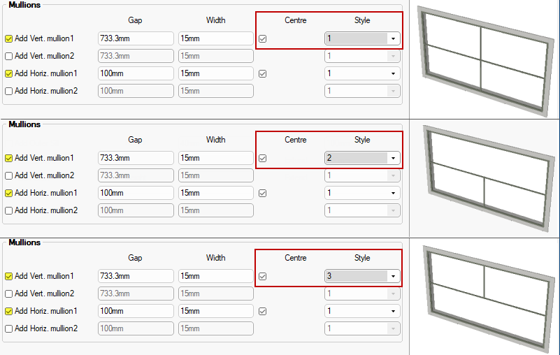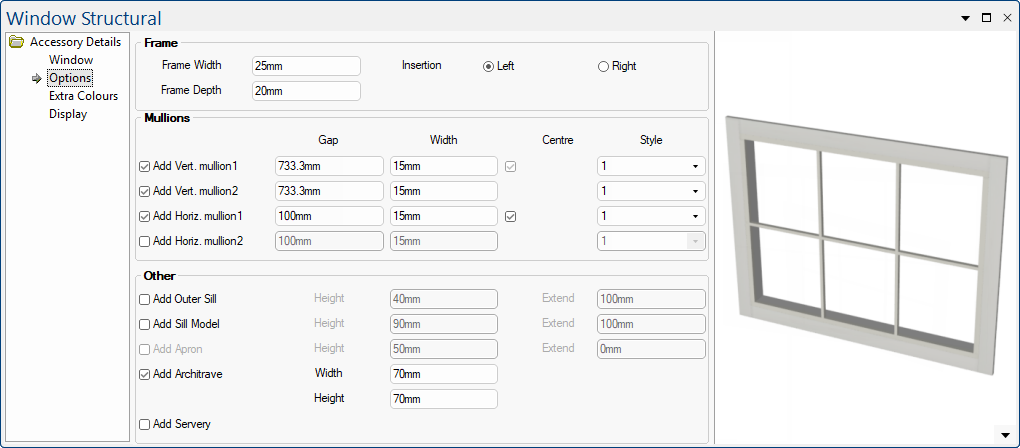 On the Options page, you can customise the Frame, Mullions and Other details of your window.