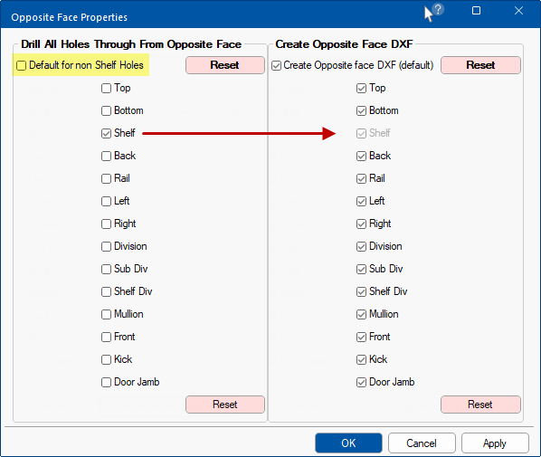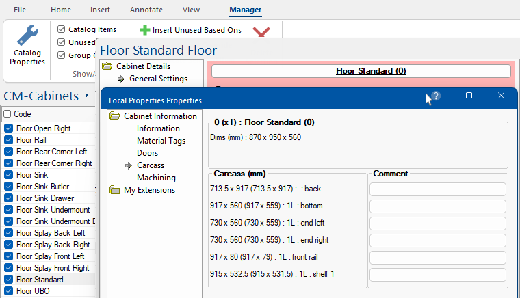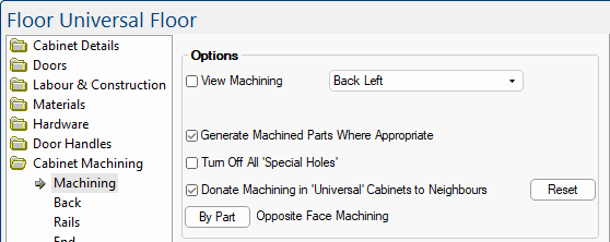 - The overall cabinet defaults can be reset back to the or reset to the local properties. For further details see topic on Universal Cabinet Machining.