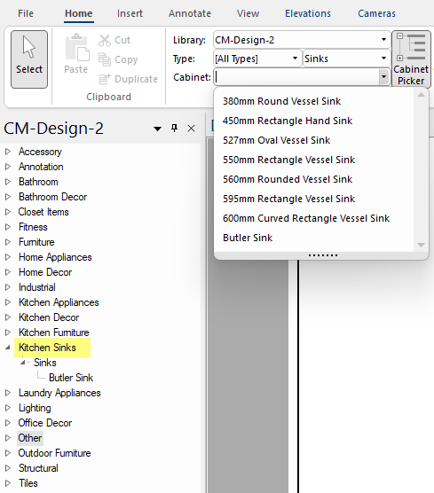 A model of a cutlery tray can now be used. It will appear in the top drawer in a set of drawers if one of the Hardware Accessory Item selected on the cabinet is a 'Cutlery Tray' with a quantity of at least one (1).