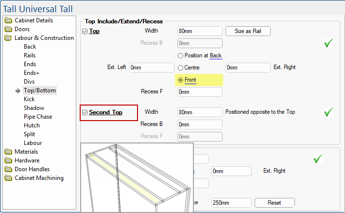 - Placing the top (rail) to the Front or Back allows a second Top (rail) to be added on the opposite side i.e if the first is placed at the front, then the second would be at the back. Each of these can then be individually sized.