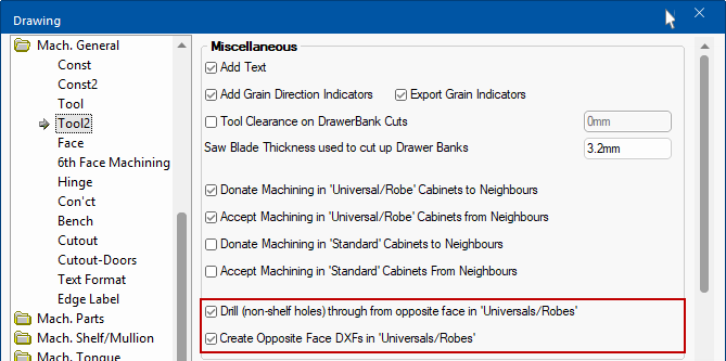 - Universals and Robes : Drill Through and Opposite Face DXF drawing defaults added Mach.General > Tool2 page.