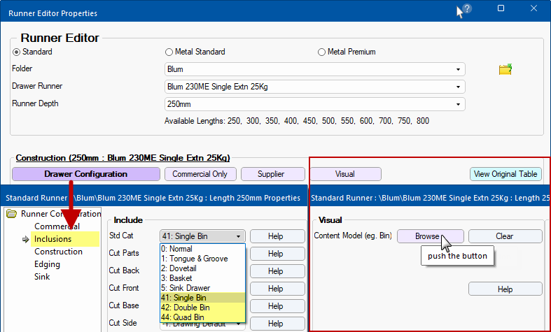A Bin Model can be associated with the runner system, using the Visual button, as shown.